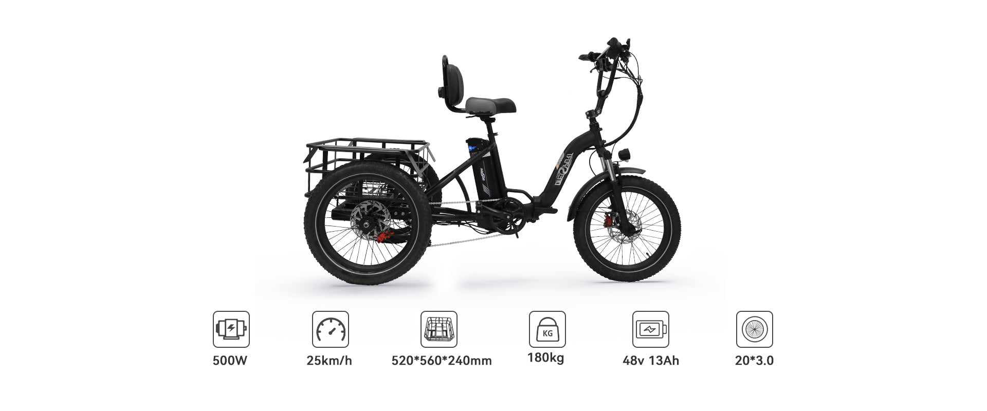 Diseñado con una función plegable, lo que facilita su almacenamiento y transporte. Este triciclo eléctrico compacto ofrece la combinación perfecta de comodidad y versatilidad para tus necesidades diarias.