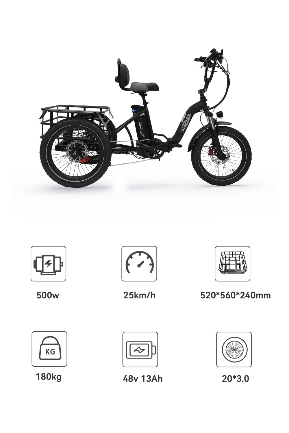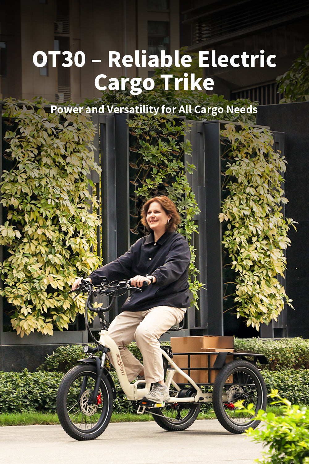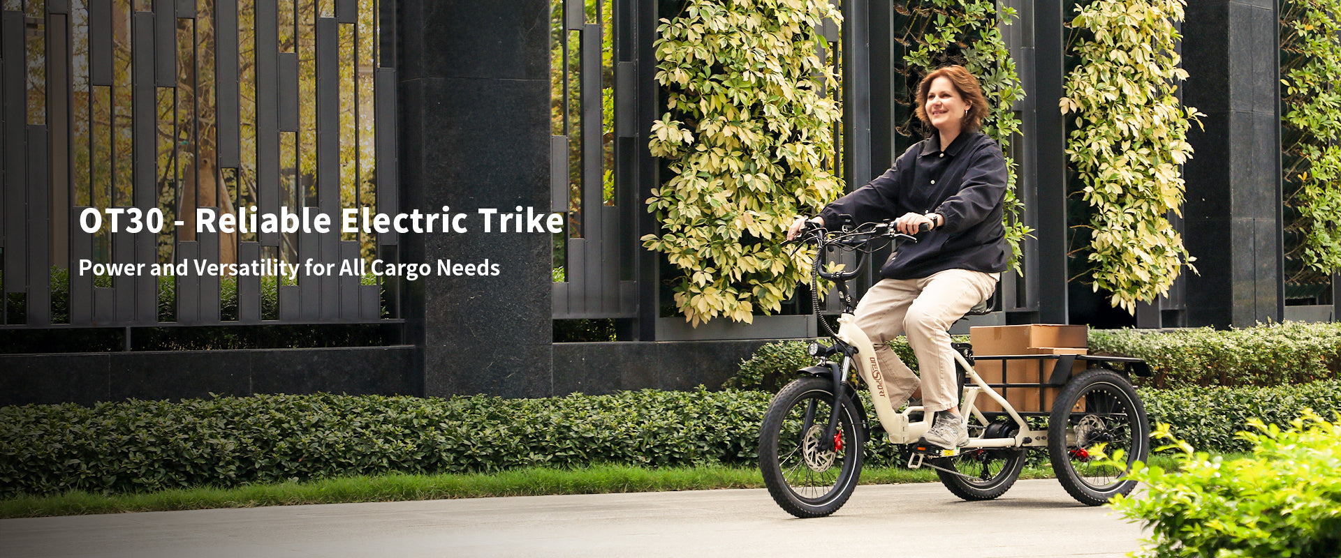 Impulsado por un motor Bafang de 48 V y 500 W, el triciclo eléctrico OT30 ofrece un rendimiento suave y fiable para tus paseos. Con un robusto par motor de 65 Nm, se adapta fácilmente a diversos terrenos y garantiza subidas sin esfuerzo. Ideal para quienes buscan una potente bicicleta eléctrica de 3 ruedas.
