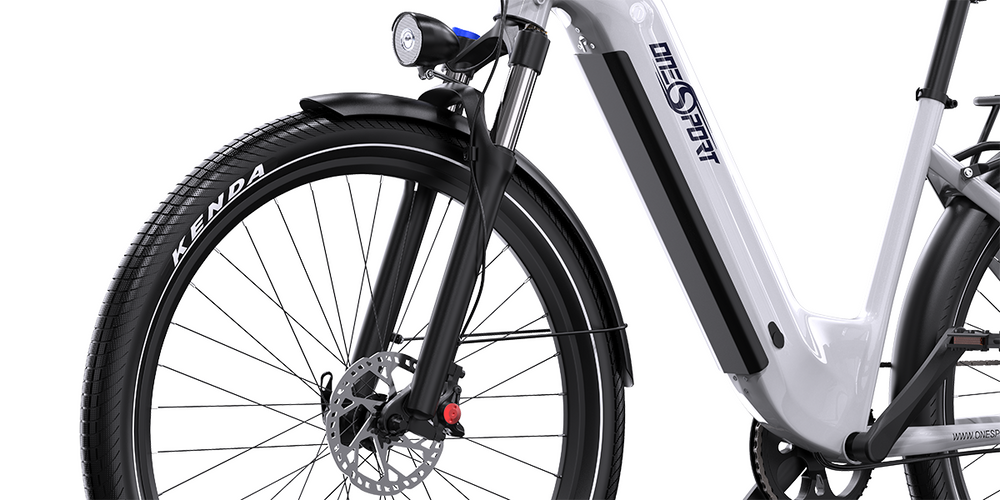 OT05 city e-bike equipped with a shock-absorbing front fork, ensures a smoother ride by effectively dampening bumps and vibrations, particularly on rough or uneven surfaces, enhancing comfort and control.