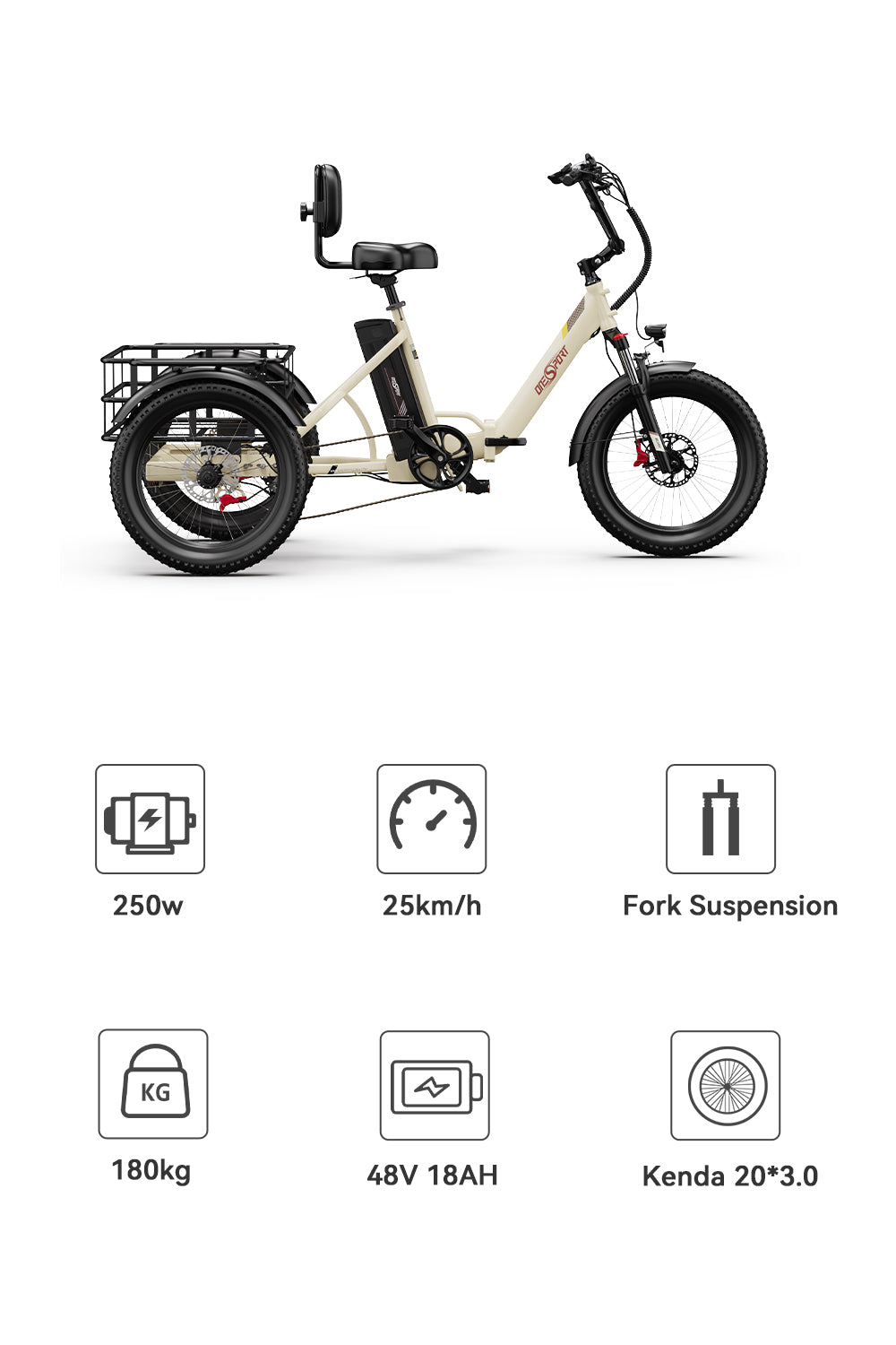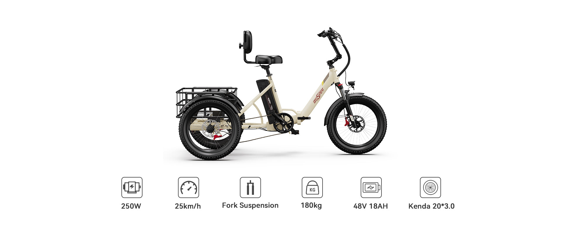 Powered by a 48V 250W motor with 60Nm torque, this OT30Pro tricycle delivers strong acceleration and excellent climbing ability—perfect for heavy loads and uphill rides.