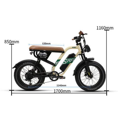 Equipped with wide 20*4 inch tires, this vintage fat tire e-bike offers superior traction and stability on a variety of surfaces. The large, thick tires provide a smooth ride, absorbing shocks from rough terrain and ensuring comfort whether you're cruising through the city or tackling off-road trails. Perfect for both urban and outdoor adventures!